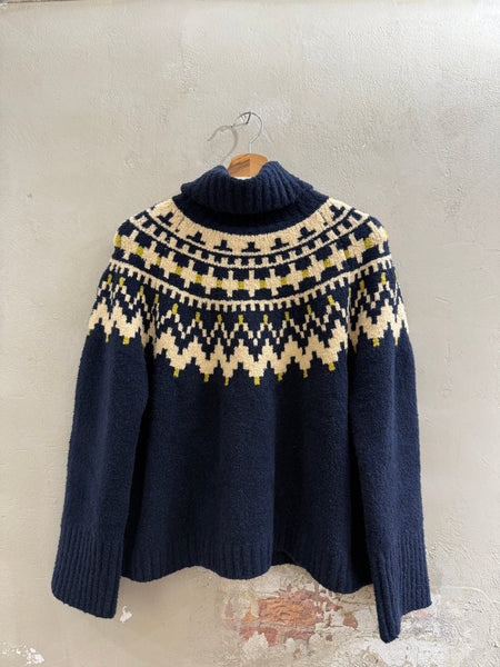 Kuscheliger Strickpullover von Masai mit hohem Rollkragen und typischem Norwegermuster Muster in Navy, Creme und Oliv. Die lockere Passform und die breiten Rippbündchen sorgen für Komfort und einen modernen Look – ideal für stilvolle Winter-Outfits.