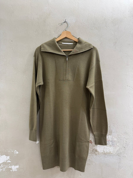 Dieses bequeme Strickkleid ist aus einem weichen, warmen Material gefertigt und hat eine lockere Passform. Es ist mit langen Ärmeln, einem Stehkragen und einem halben Reißverschluss auf der Vorderseite versehen, der dem Look eine sportive Note verleiht. Die knielange Silhouette und die gerippten Ärmelbündchen machen es zum idealen Kleidungsstück für ein lässiges und zugleich stilvolles Outfit.