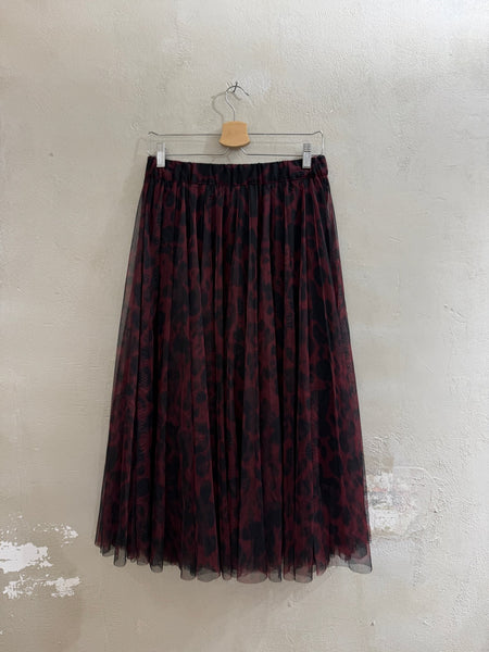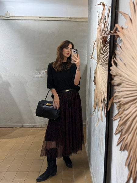 Dieser Tüllrock vereint feminine Leichtigkeit mit einem modernen, kantigen Touch. Das feine Leopardenmuster sorgt für Charakter, während der fließende Stoff bei jeder Bewegung sanft mitschwingt. Ein stilvoller Begleiter für Alltag und Abend.