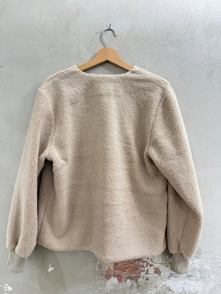 Kuschelig-weiche Teddyjacke von Masai in angesagter Boxy-Silhouette. Der V-Ausschnitt mit Druckknöpfen und die aufgesetzten Taschen machen sie zu einem lässigen Essential für kalte Tage. Durch das neutrale Beige lässt sie sich vielseitig kombinieren – von casual mit Jeans bis hin zu cozy Layering über Kleidern.